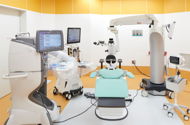 当クリニックでは、日帰り手術、診断機器ともに、大学病院と同等以上の最先端の診療機器を備え、安全、安心な眼科日帰り手術、外来診療を実現します。一例を挙げると、網膜・緑内障診断に不可欠な最新の画像診断機器、前眼部画像診断、ヘッドマウント型視野検査、手術機械と連動する白内障術前検査機器、3次元手術システム、緑内障の低侵襲レーザー治療機器などを完備しています。